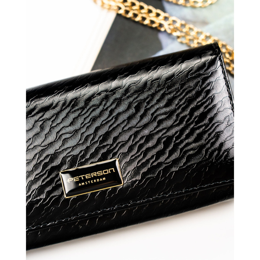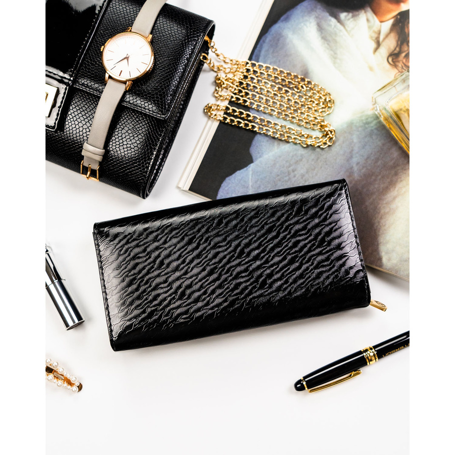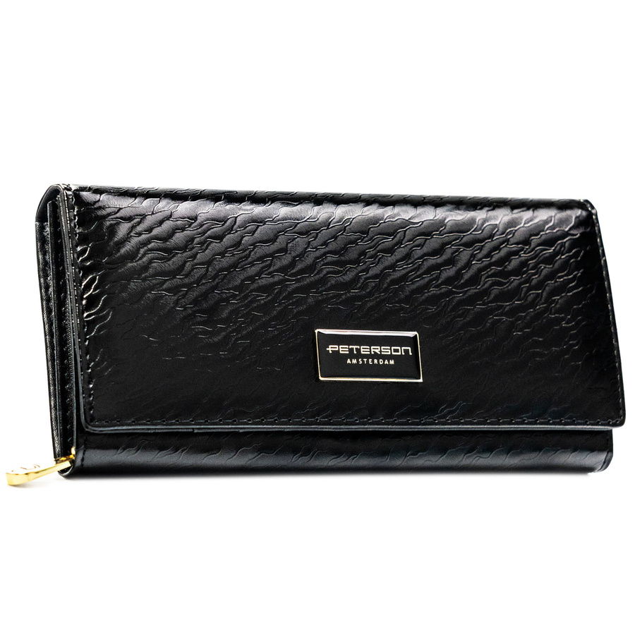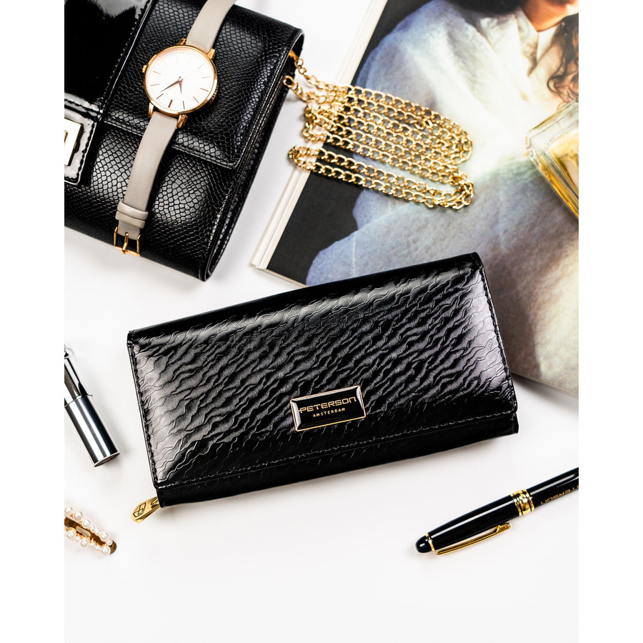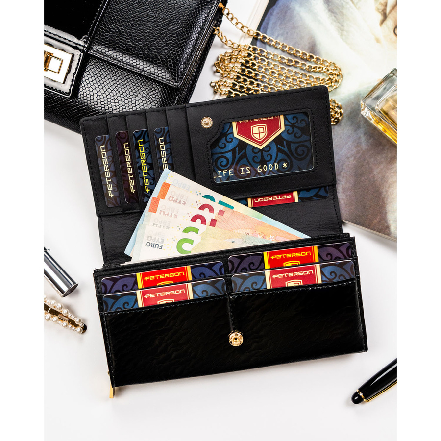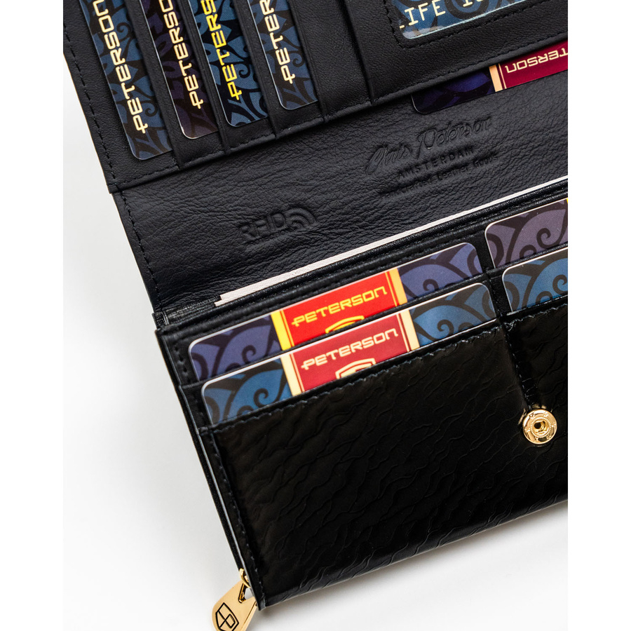 Duży, skórzany portfel damski w czarnym kolorze zamykany na zatrzask - Peterson