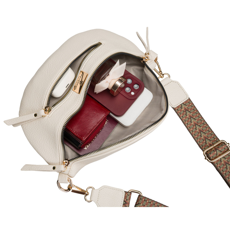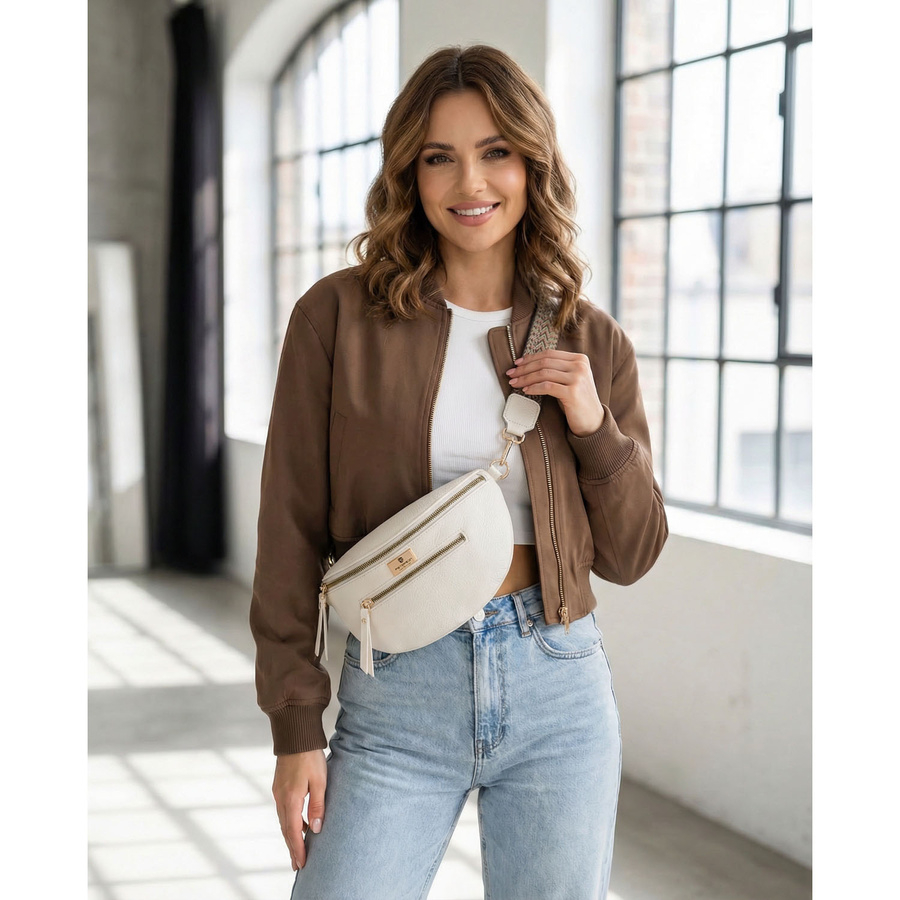 • Model wyposażono w szeroki, regulowany pasek o maksymalnej długości 140 cm, który pozwala dopasować torbę do sylwetki i preferowanego sposobu noszenia. Nerka może być noszona klasycznie w pasie lub wygodnie przez ramię jako saszetka typu crossbody.