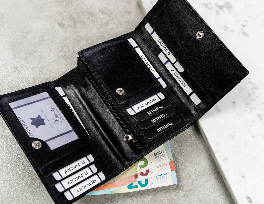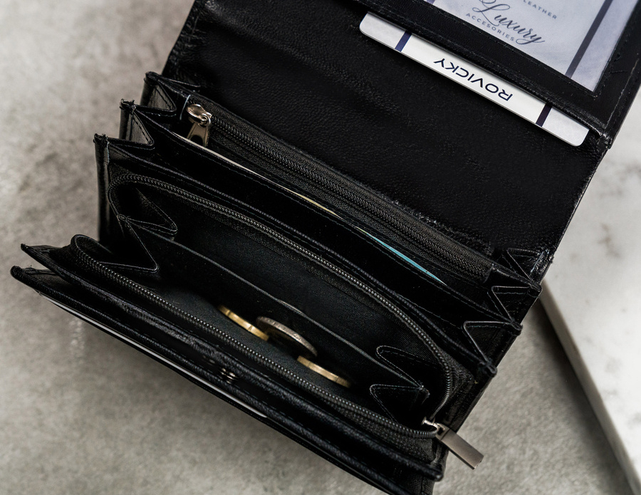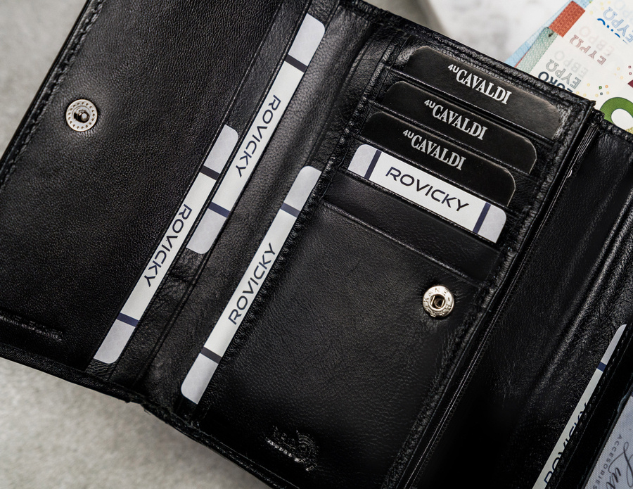 6 buzunare pentru documente în format mai mare, cum ar fi un certificat de înregistrare în copertă. Doua dintre aceste buzunare sunt situate in exterior, in spatele portofelului, unul dintre ele este deschis, celalalt inchis cu fermoar. Cu toate acestea, vă recomandăm să păstrați documentele importante în interiorul unui portofel închis cu o clipă.