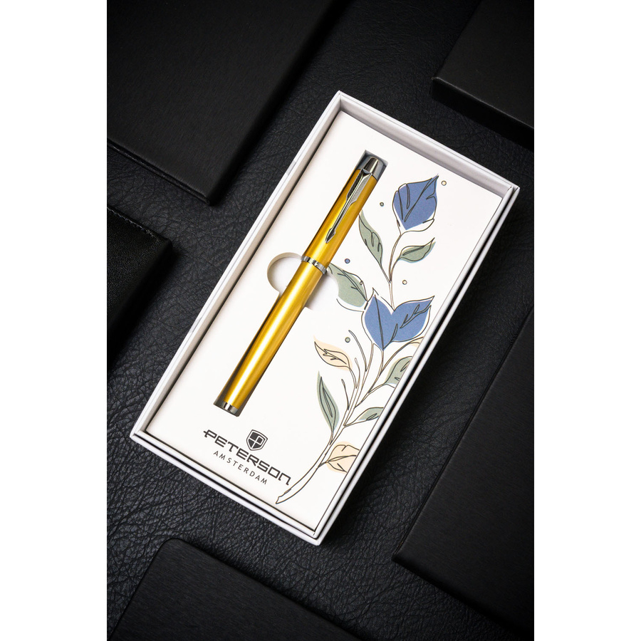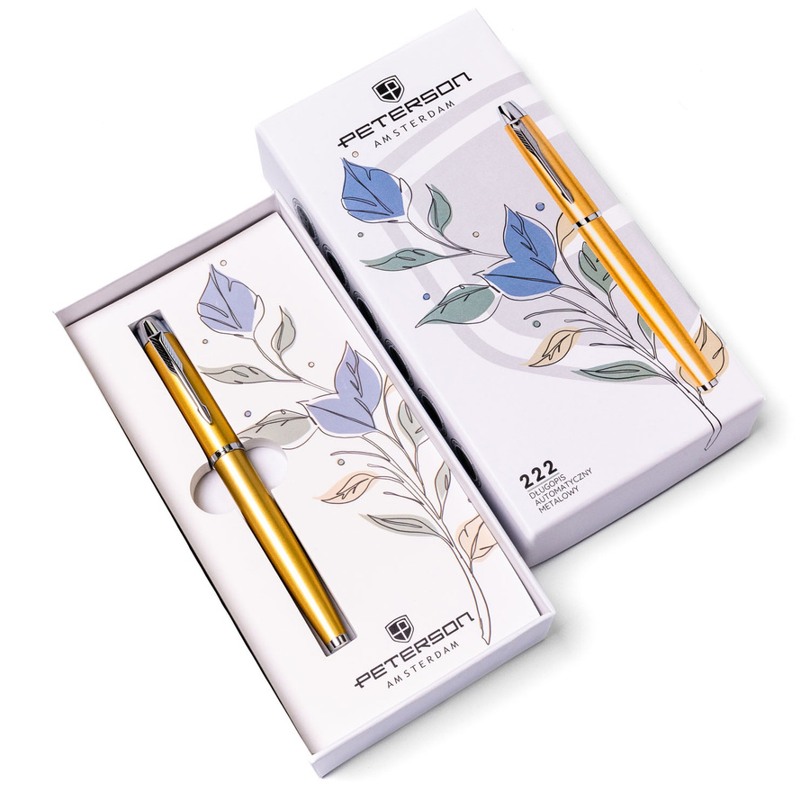Stiloul este ambalat într-o cutie elegantă de cadou, cu un motiv floral delicat. Este cadoul perfect pentru cei care apreciază stilul, eleganța și funcționalitatea - este un cadou corporate excelent pentru un profesor, student sau partener de afaceri. Dimensiunile cutiei