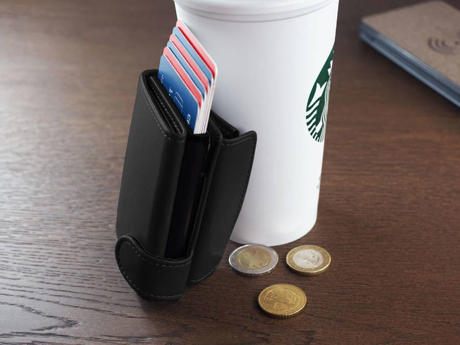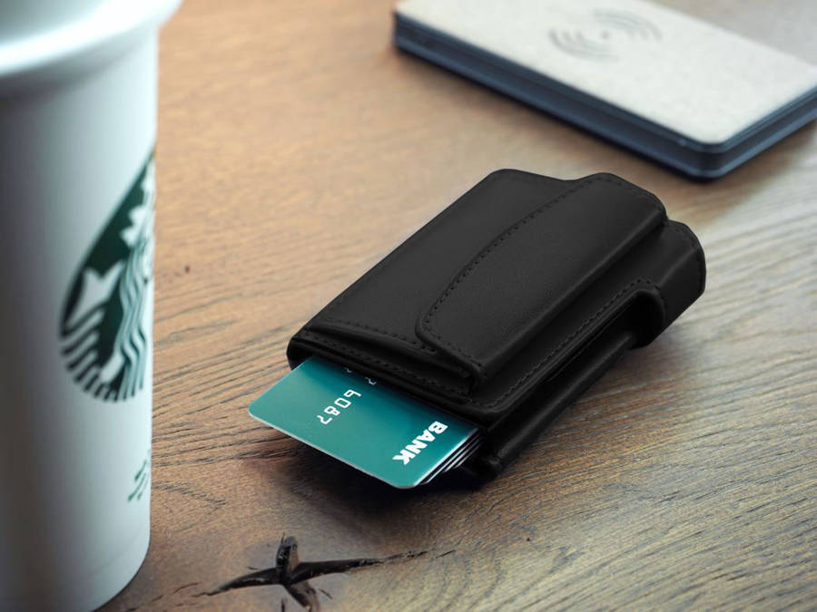 Portofelul este echipat cu o husă de protecție pentru carduri cu un sistem inteligent pentru îndepărtarea ușoară a cardului - doar trageți de pârghia mică și cardurile vor aluneca imediat. Fabricat din aluminiu, protejează cardurile împotriva îndoirii, ruperii și tranzacțiilor nedorite fără contact (tehnologie SISTEM DE BLOCARE RFID)