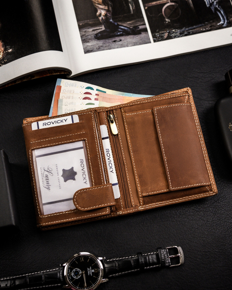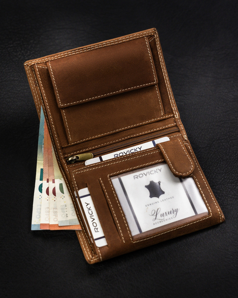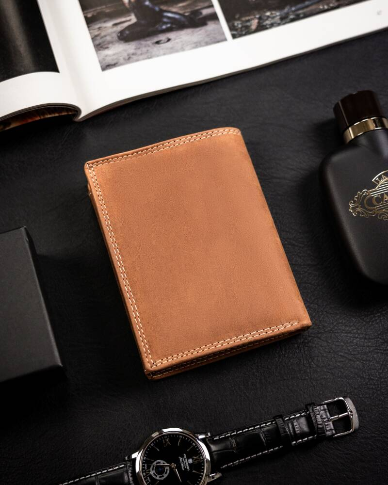 Portofel din piele naturala nubuck rezistenta. Un model cu un stil clasic. Portofel în orientare portret, fără închidere externă