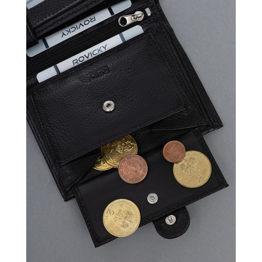 Este prevăzut un compartiment separat pentru monede, asigurându-se că acestea nu interferează cu utilizarea zilnică sau nu deteriorează interiorul portofelului.