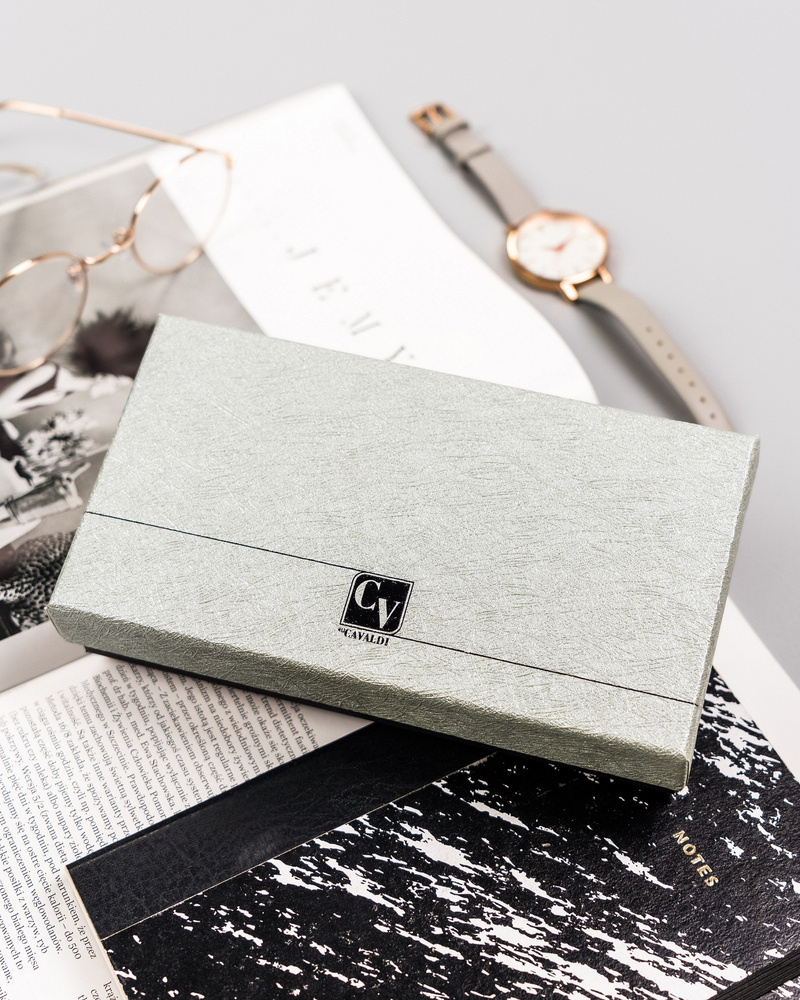 Portfel zapakowany jest w sztywne, srebrne pudełko z logo marki. Pudełko prezentowe w takim wydaniu, to oszczędność czasu i pieniędzy. Kompleksowa obsługa to nasza misja, abyś nie musiała martwić się, w co zapakować portfel jeśli to prezent i czy znajdziesz odpowiednie opakowanie.