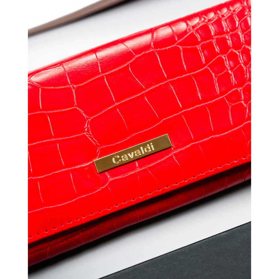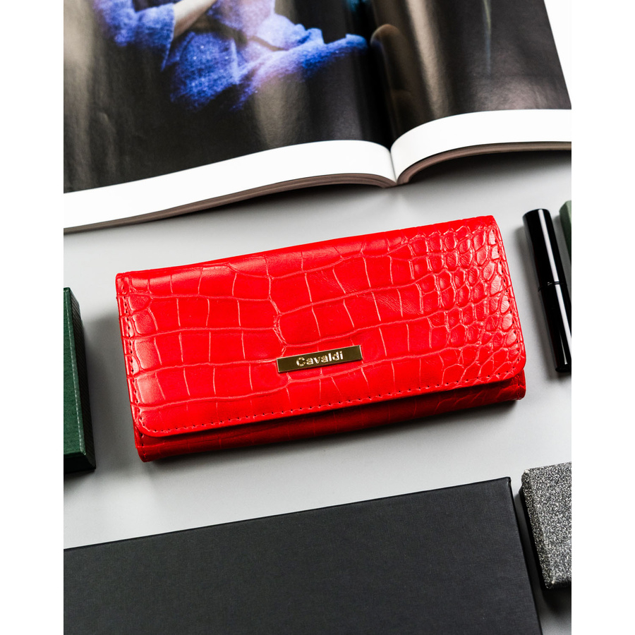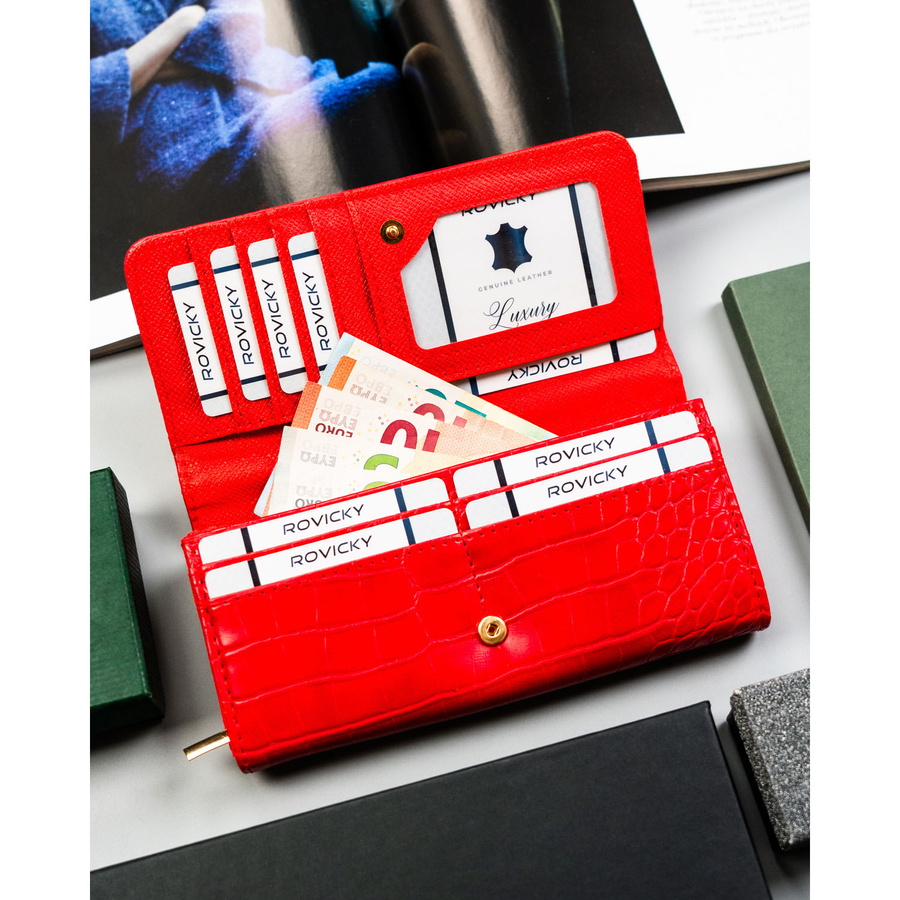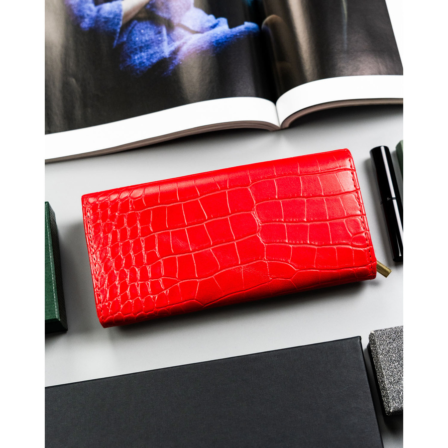 Un portofel practic și spațios pentru femei, într-o culoare roșu vibrant. Acest model are o textură delicată asemănătoare cu cea a crocodilului, conferindu-i un aspect elegant, rămânând în același timp funcțional și confortabil pentru utilizarea de zi cu zi.