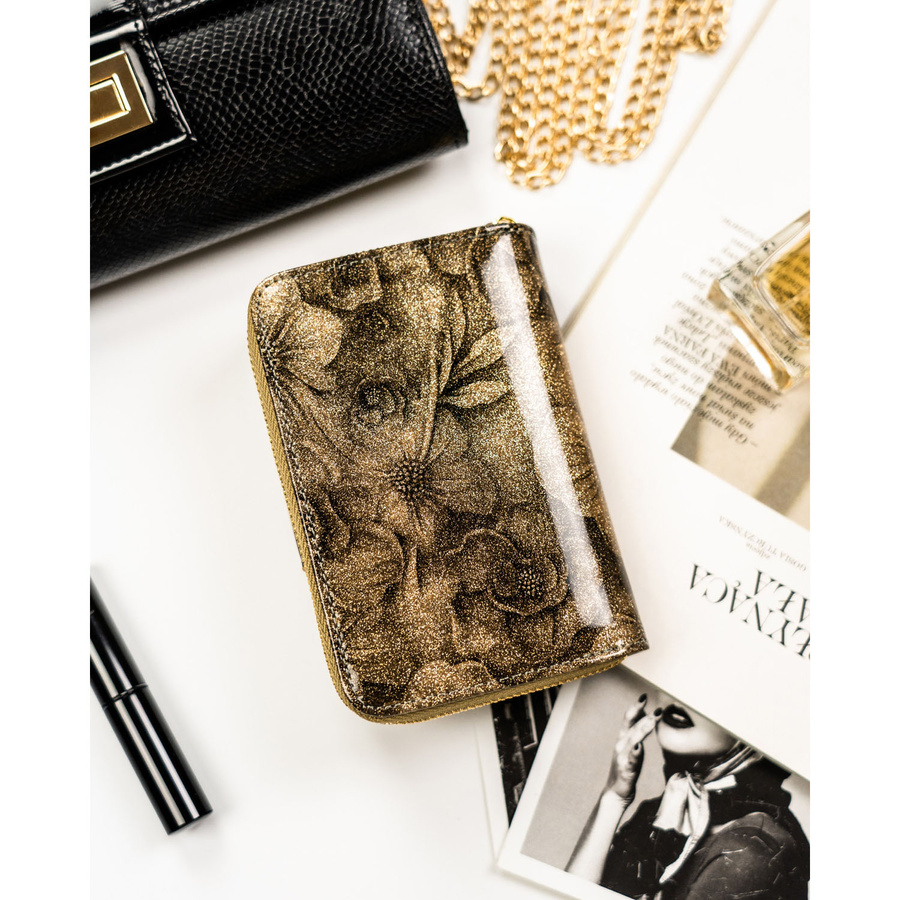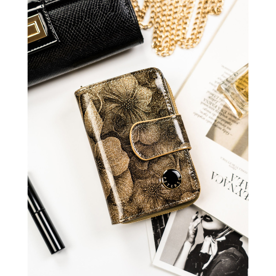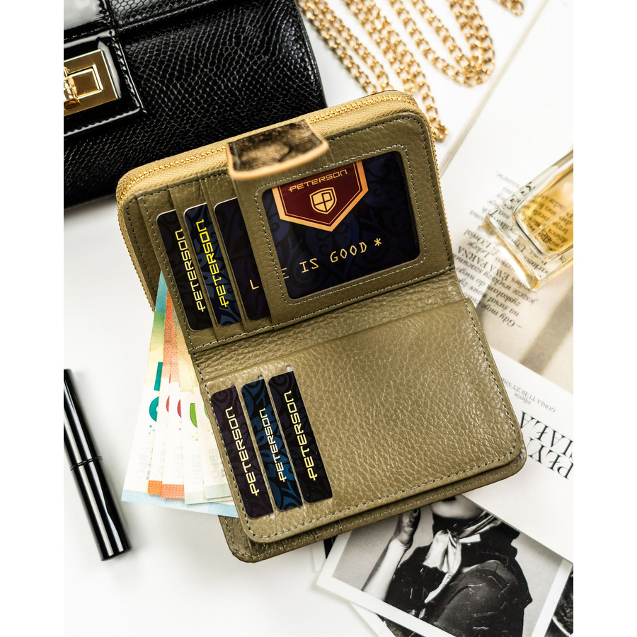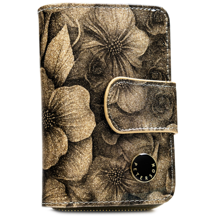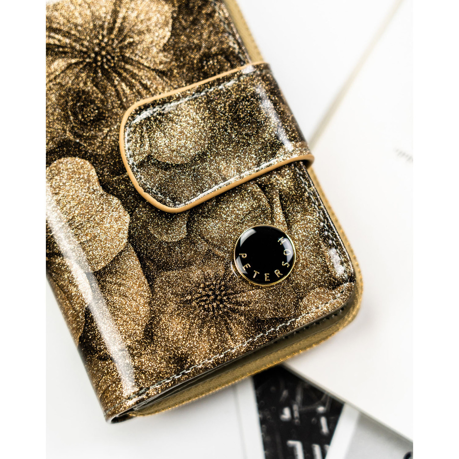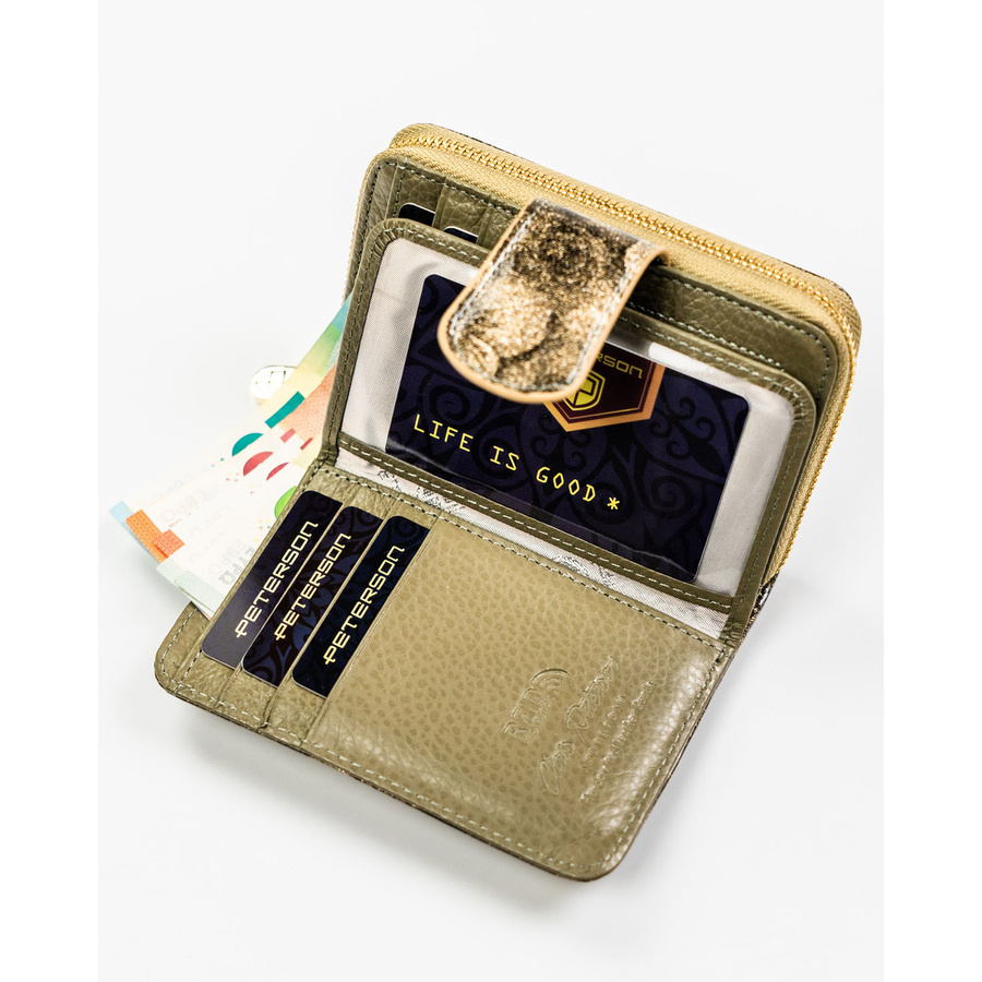 Złoty, pionowy portfel damski ze skóry naturalnej i ekologicznej, zamykany suwakiem i zatrzaskiem - Peterson