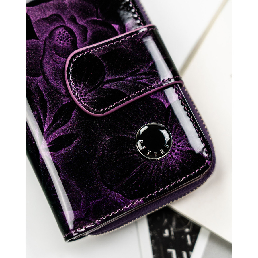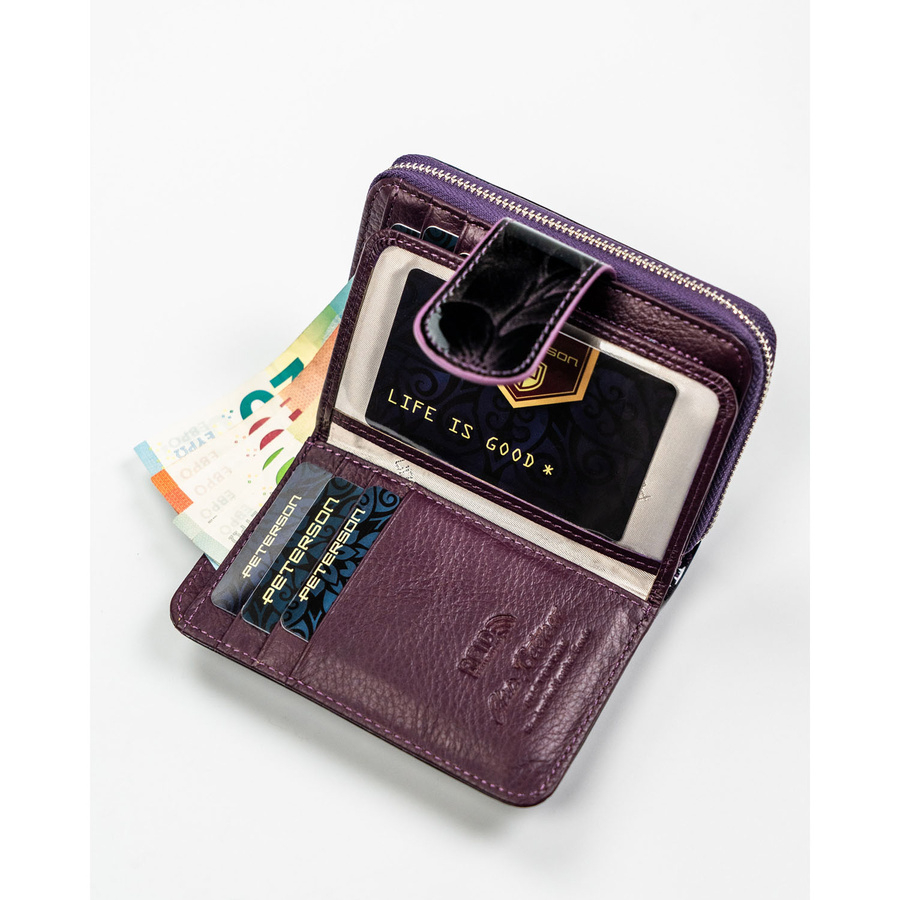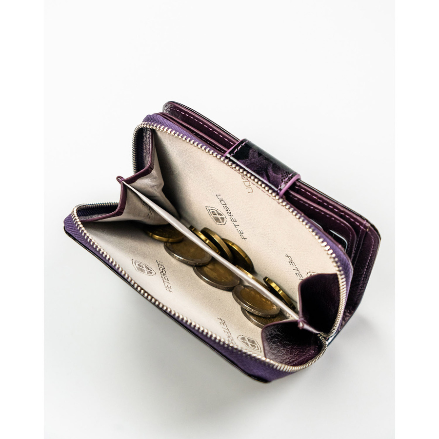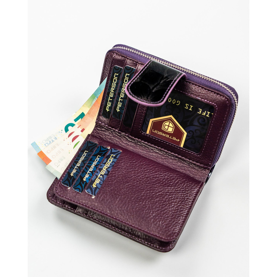 Fioletowy, pionowy portfel damski ze skóry naturalnej i ekologicznej, zamykany suwakiem i zatrzaskiem - Peterson