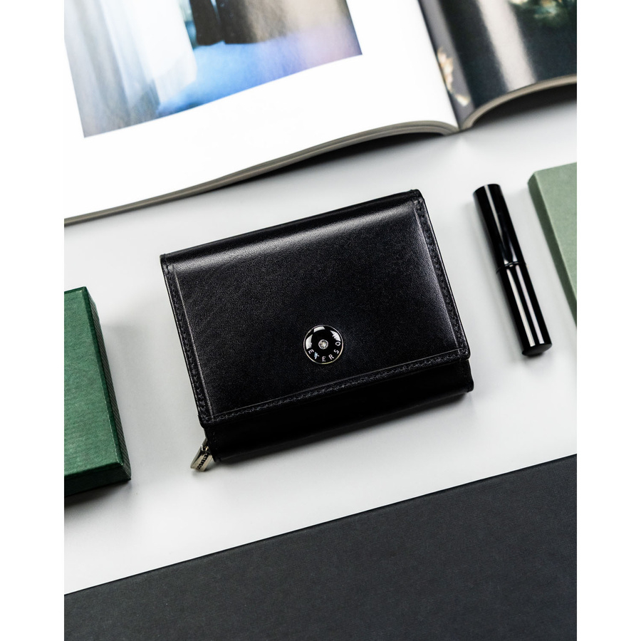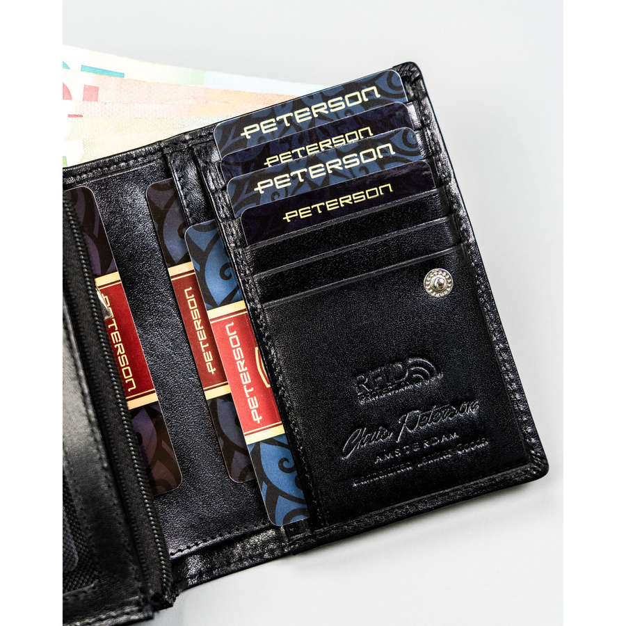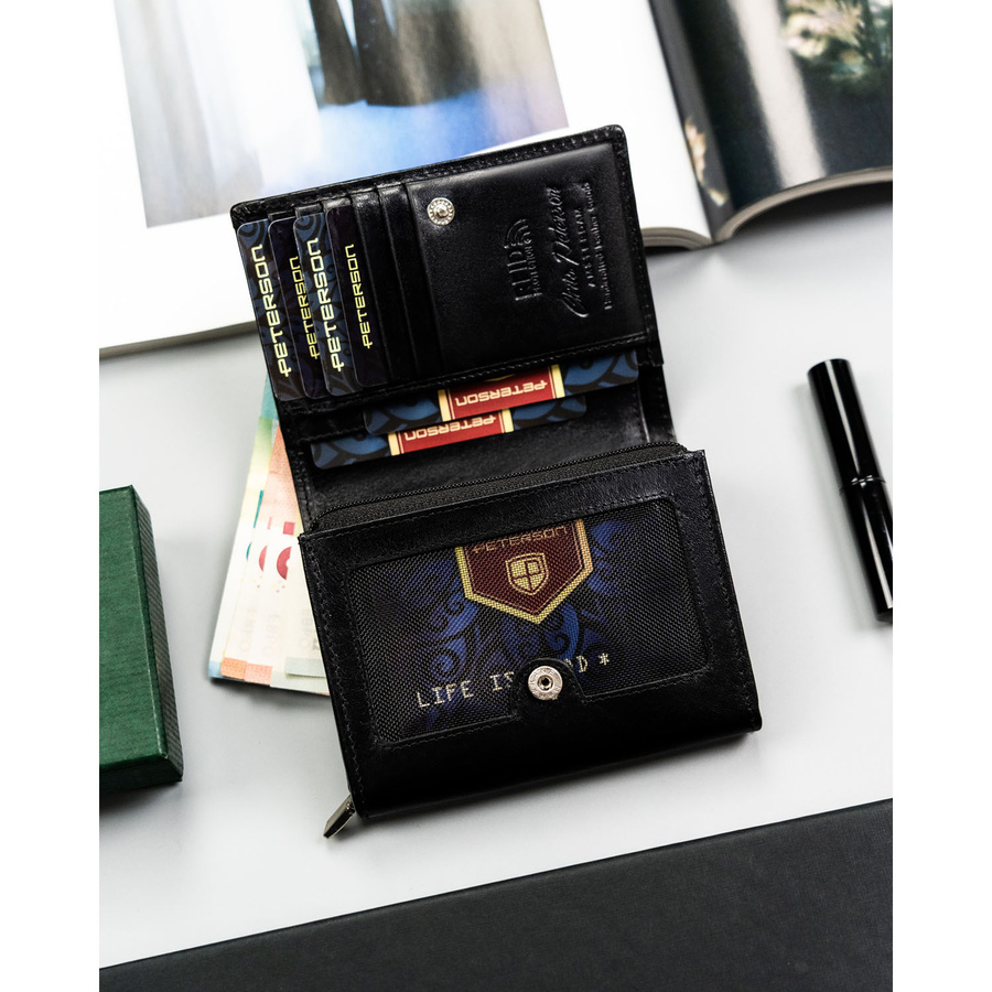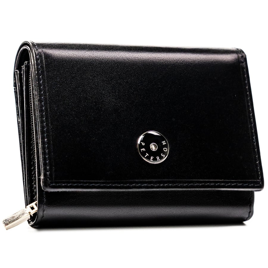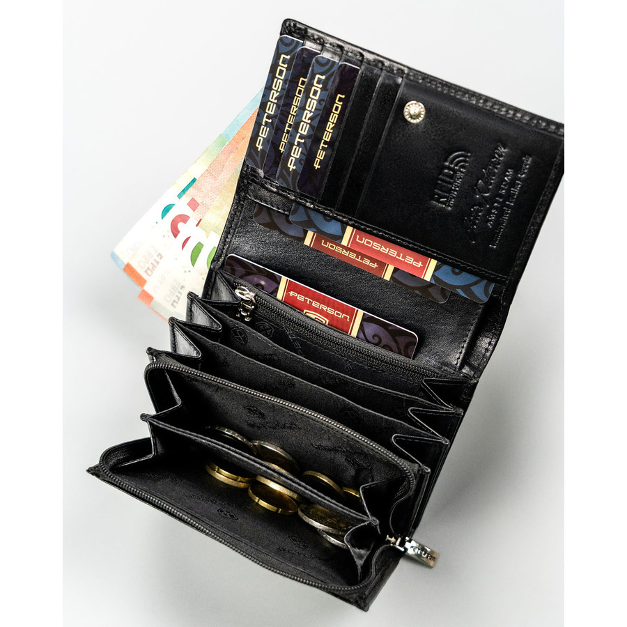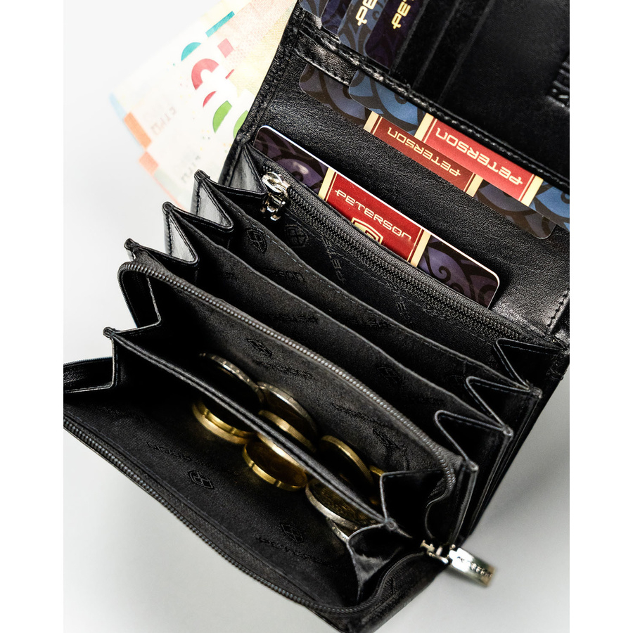 Elegancki i kompaktowy portfel damski w czarnym kolorze wykonany ze skóry naturalnej - Peterson