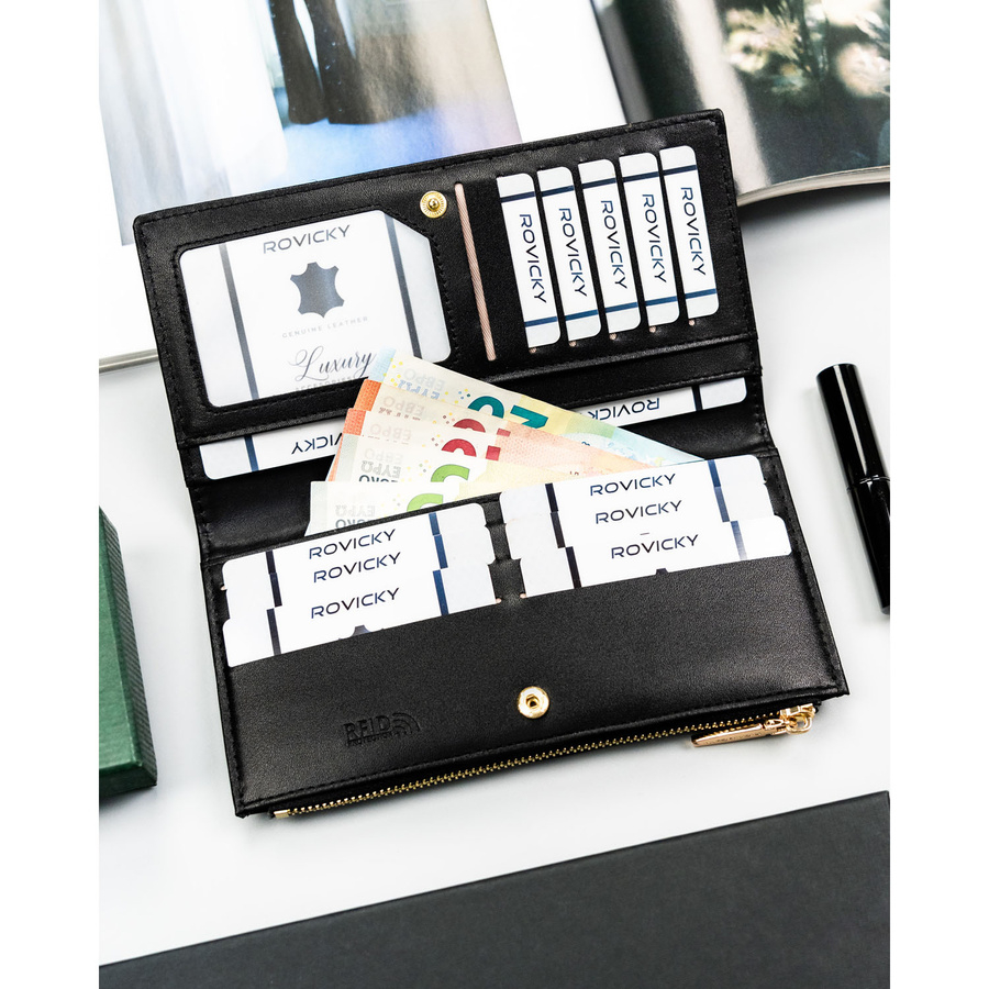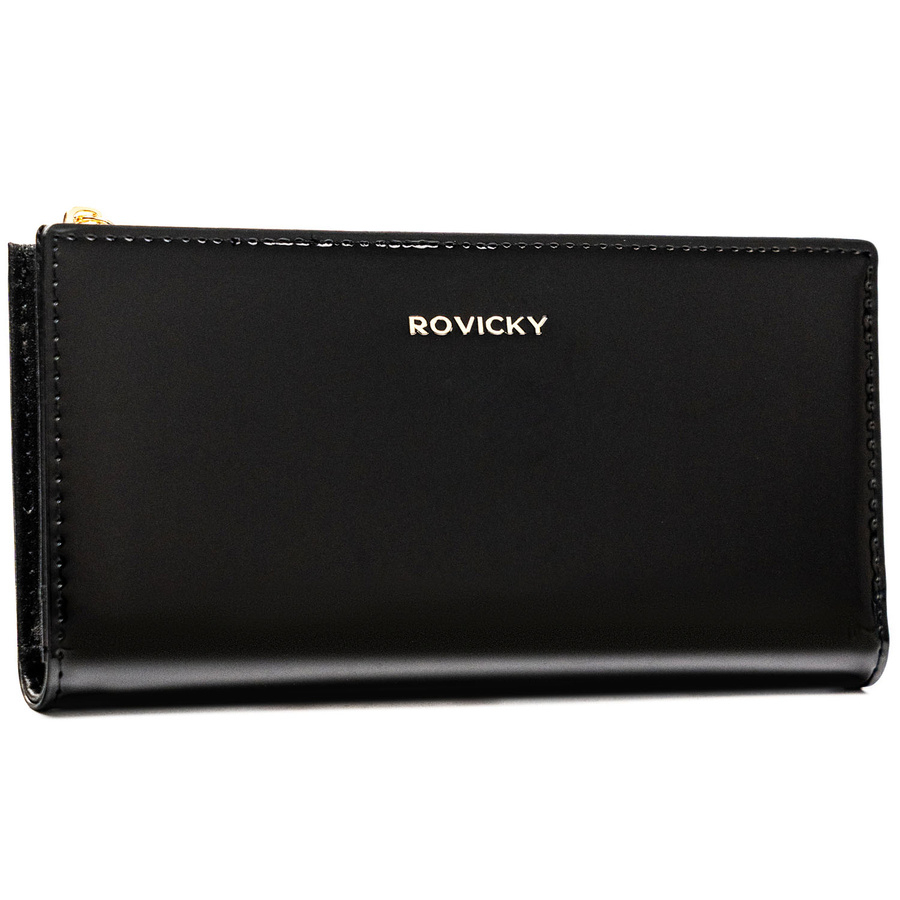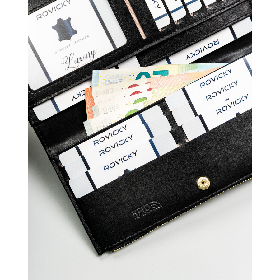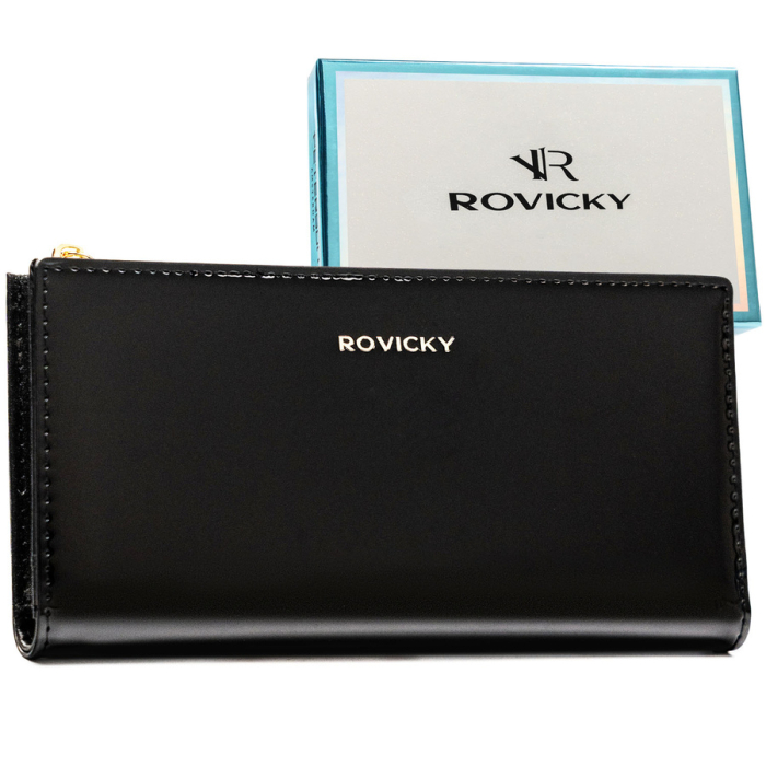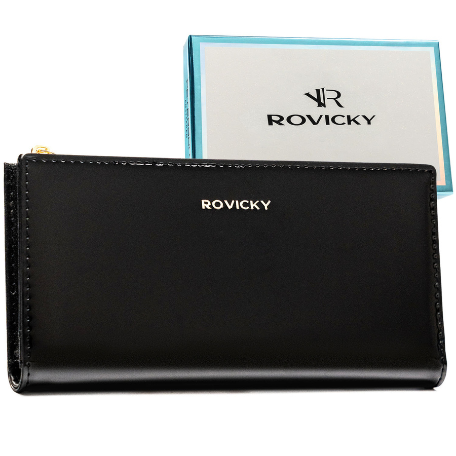 Czarny, duży portfel damski ze skóry ekologicznej zamykany suwakiem i zatrzaskiem - Rovicky