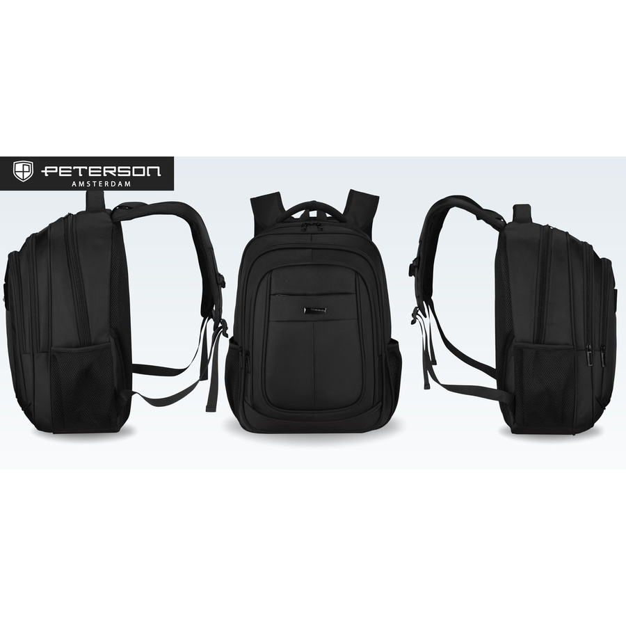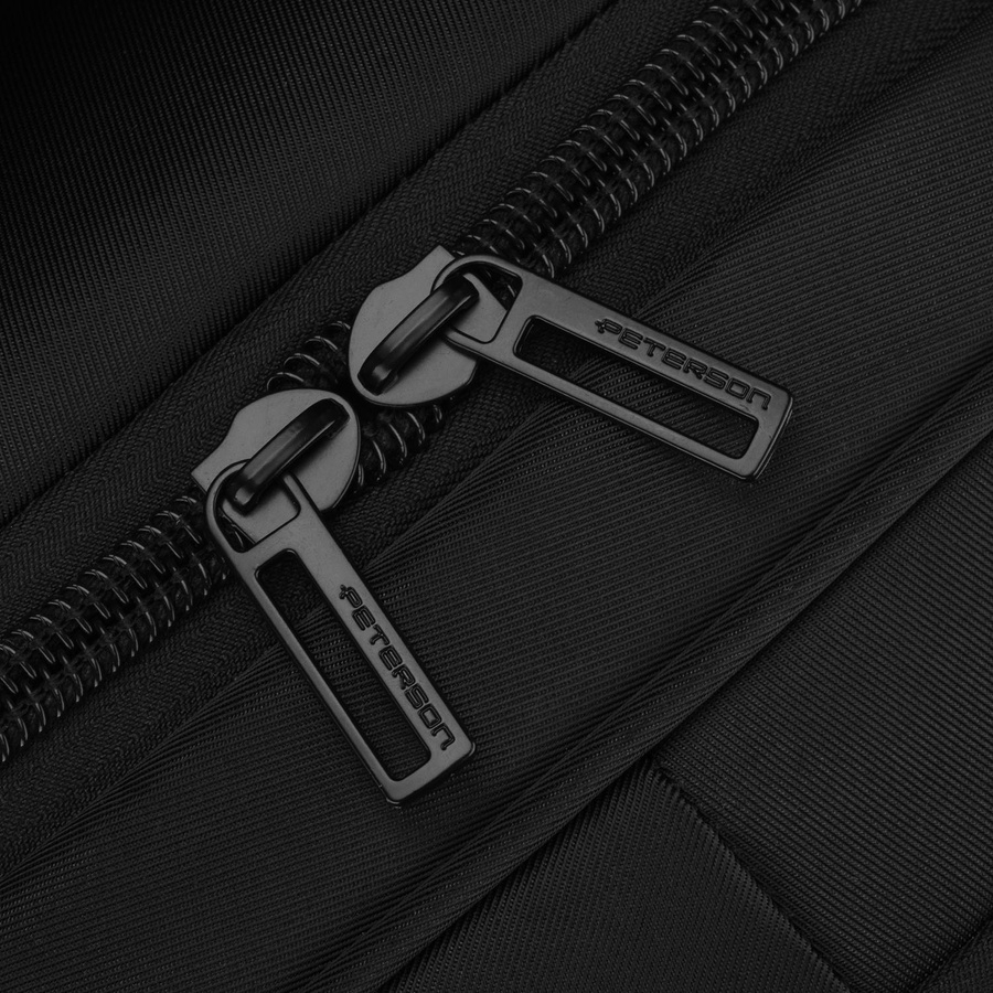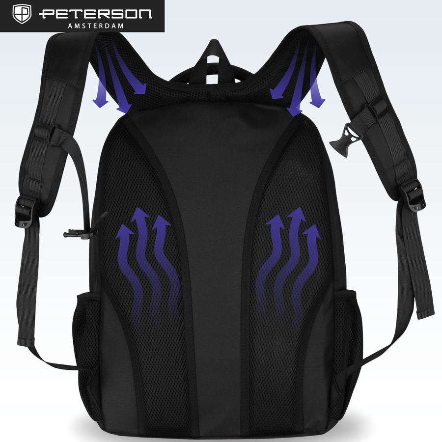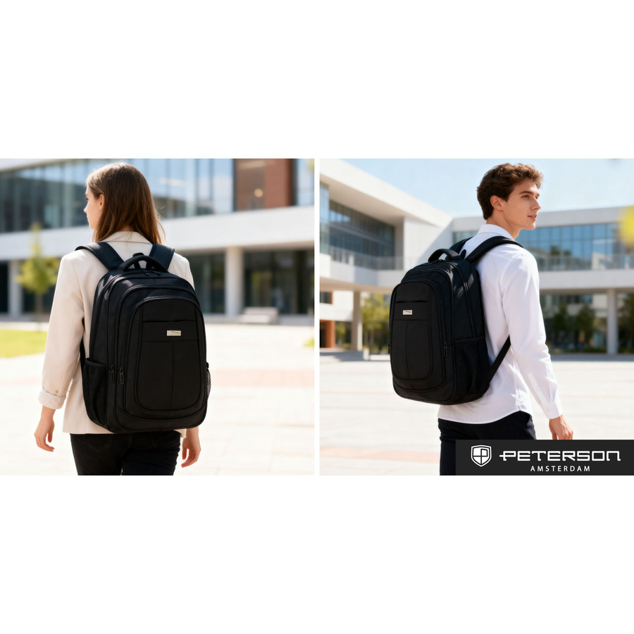 Miejski, pojemny plecak z poliestru w czarnym kolorze zawieszony na regulowanych szelkach - Peterson