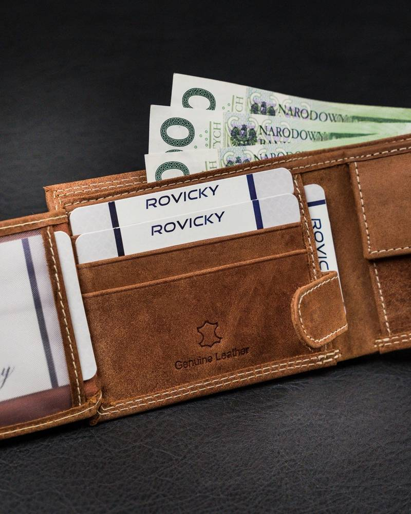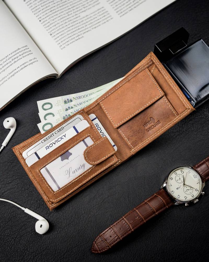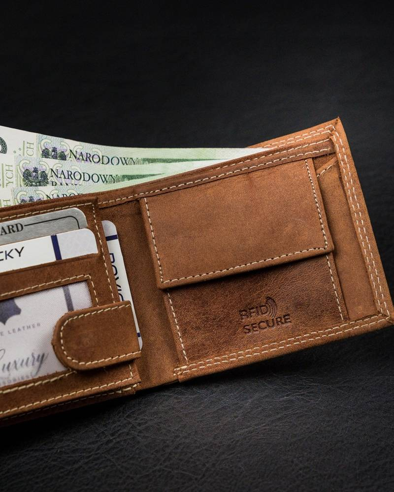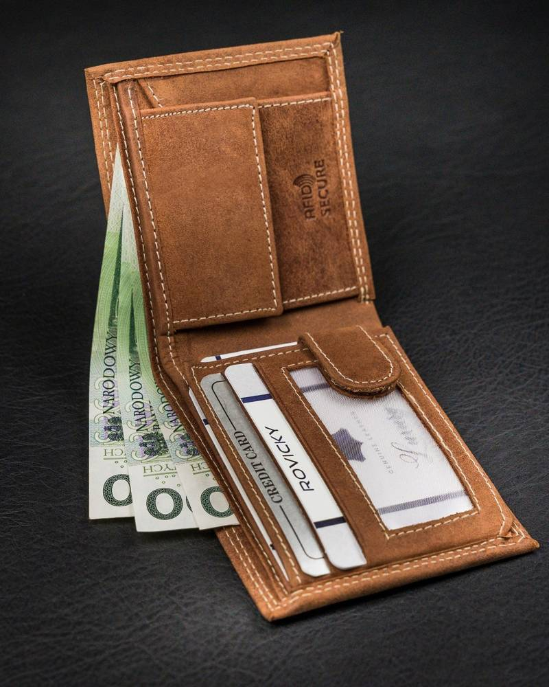 Fabricat din piele naturală de vacă. Echipat cu tehnologie RFID care protejează portofelul de hoți care folosesc cititorul de carduri. Are secțiuni extinse într-un mod foarte intuitiv - are 4 compartimente pentru carduri. Portofel fără închidere.