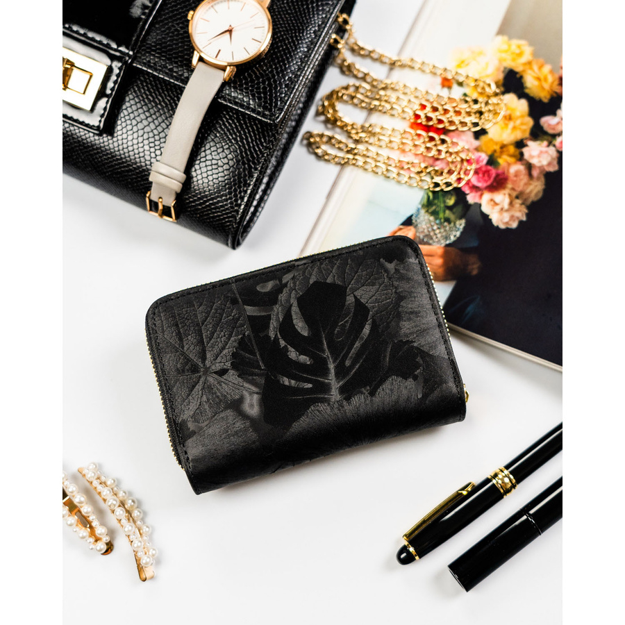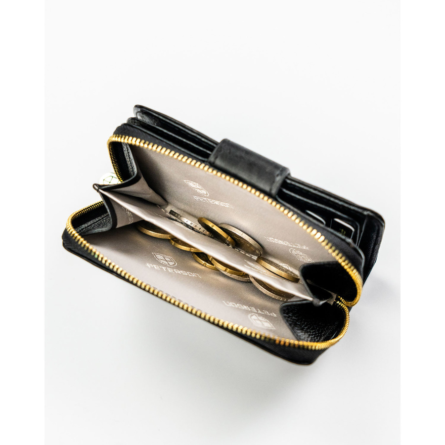 W środku znajdziesz pojemną kieszeń na banknoty oraz podwójną przegrodę na monety, zabezpieczoną solidnym suwakiem. Dzięki temu zarówno drobne, jak i większe nominały są zawsze dobrze zorganizowane i łatwo dostępne.