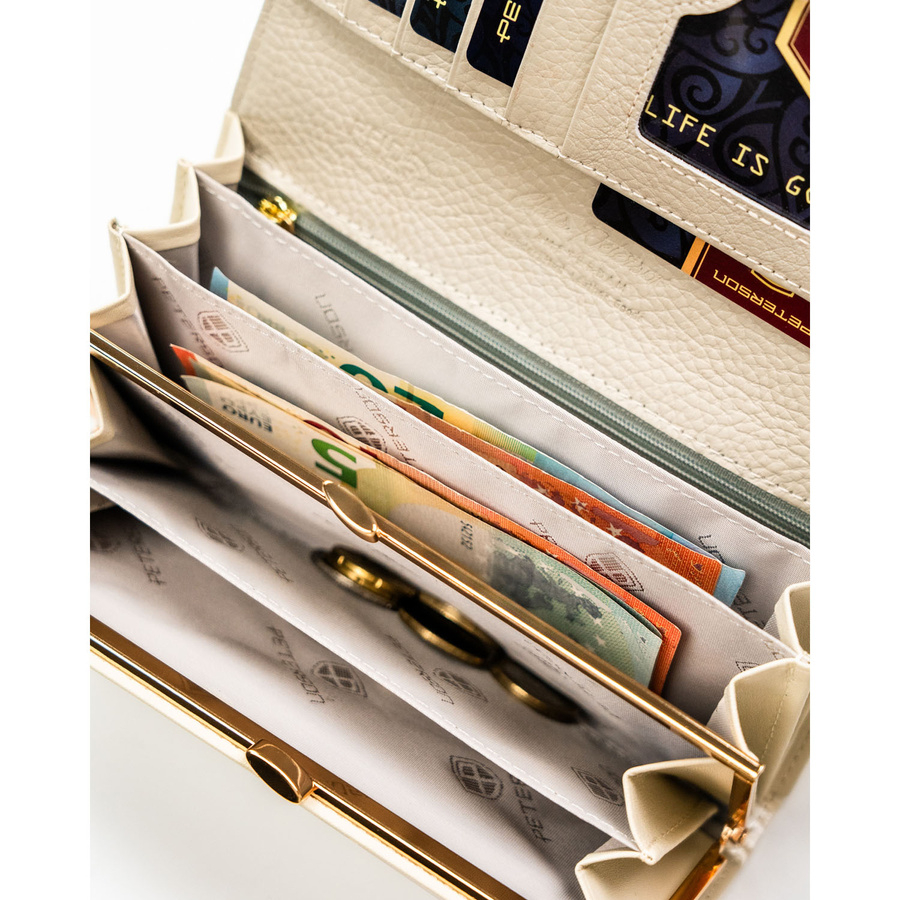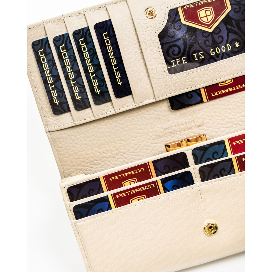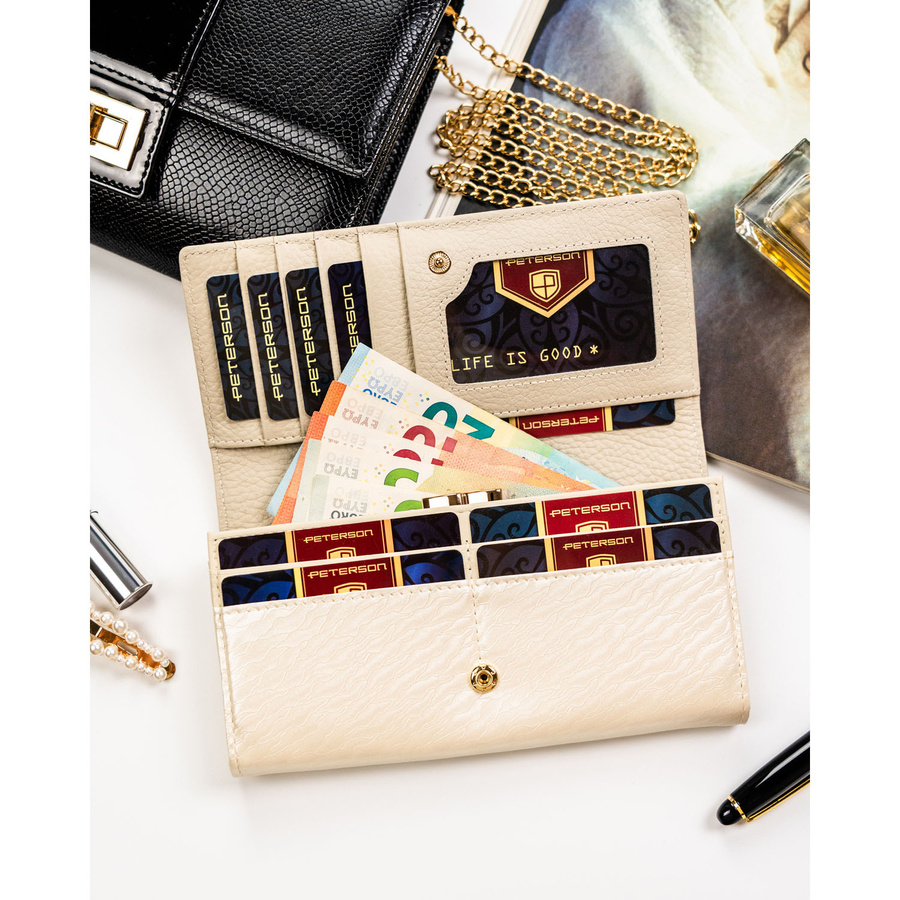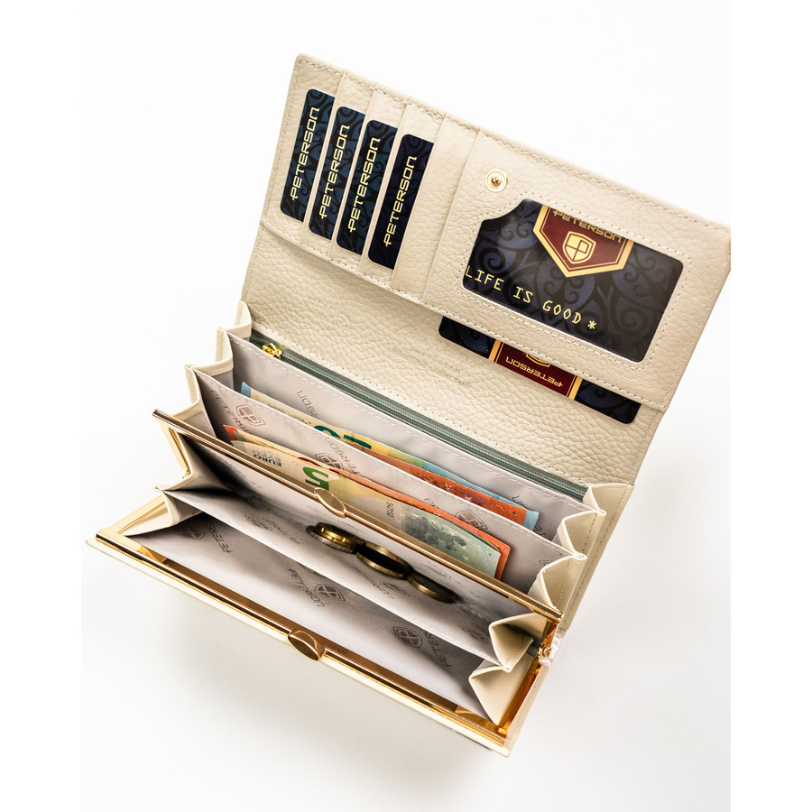 Portfel damski w kolorze ecru zamykany na zatrzask, w środku kieszonka na suwak - Peterson